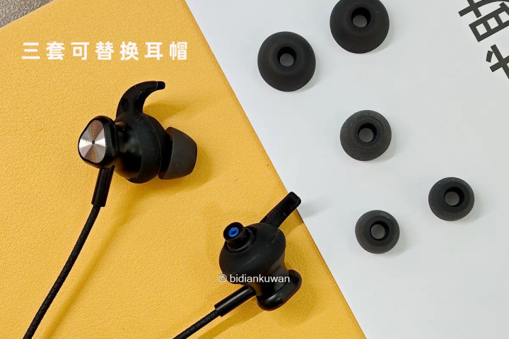 耳机带耳鳍,可更换耳帽(附带大中小共三对),可以兼容适配不同人耳形状,出线位置合理,戴着时不会因为大幅度动作晃掉耳机,因此也适用于运动场景。