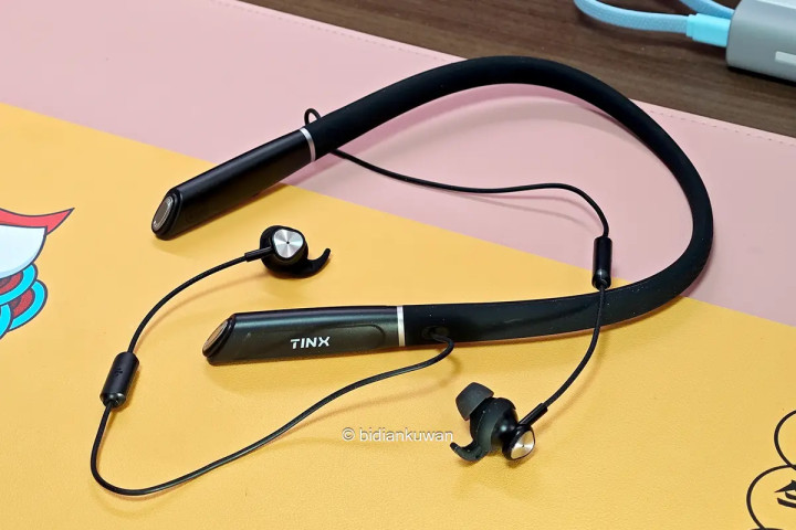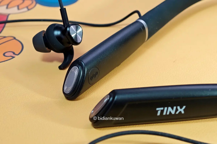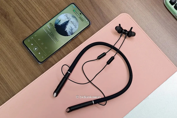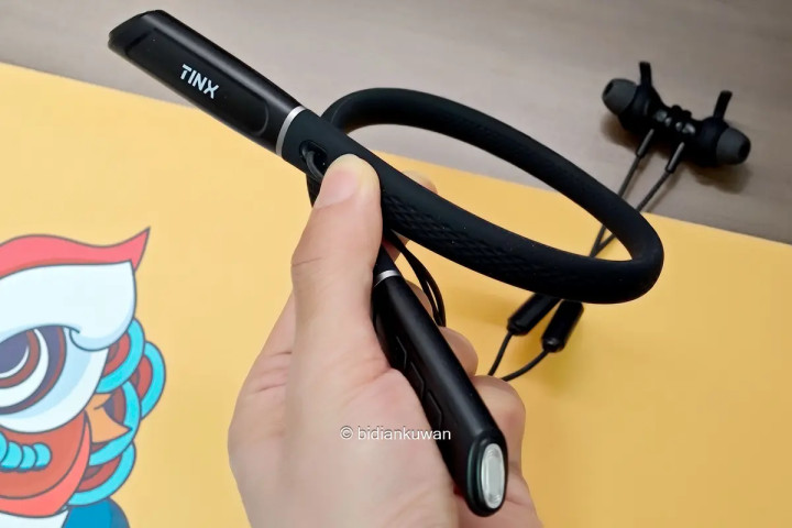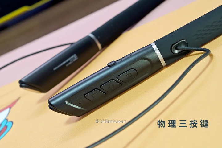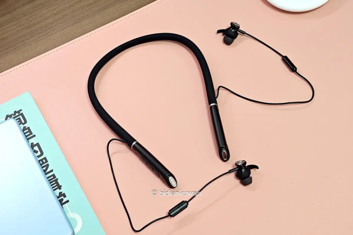耳机挂脖的部分选材不错,柔韧有记忆,整机重量才64克,贴肤舒适。大部分重量都在挂脖结构上,佩戴时压力均匀分布,轻盈无感。